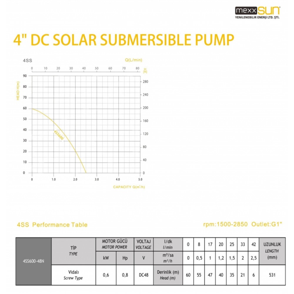 DC POMPA 0,8Hp 600W (Screw Type) (4SS600-48N)